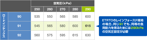 ETRTOレインフォースド規格の場合、ロードインデックス「91」のタイヤに空気圧を「290kPa」で設定すると